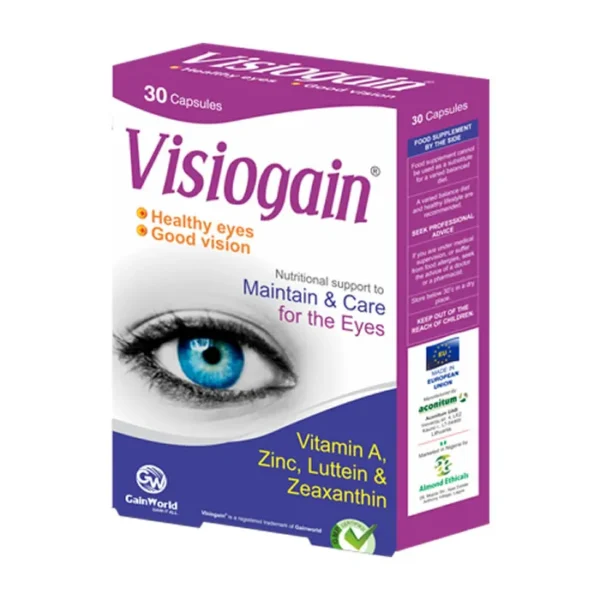 Visiogain x30 Capsules is a specialized supplement formulated to support and maintain optimal eye health. Packed with essential vitamins and natural extracts, including Vitamin A, Bilberry Fruit Extract, Zinc, Lutein, and Zeaxanthin, Visiogain is designed to protect your eyes from strain, support visual acuity, and promote overall eye health.